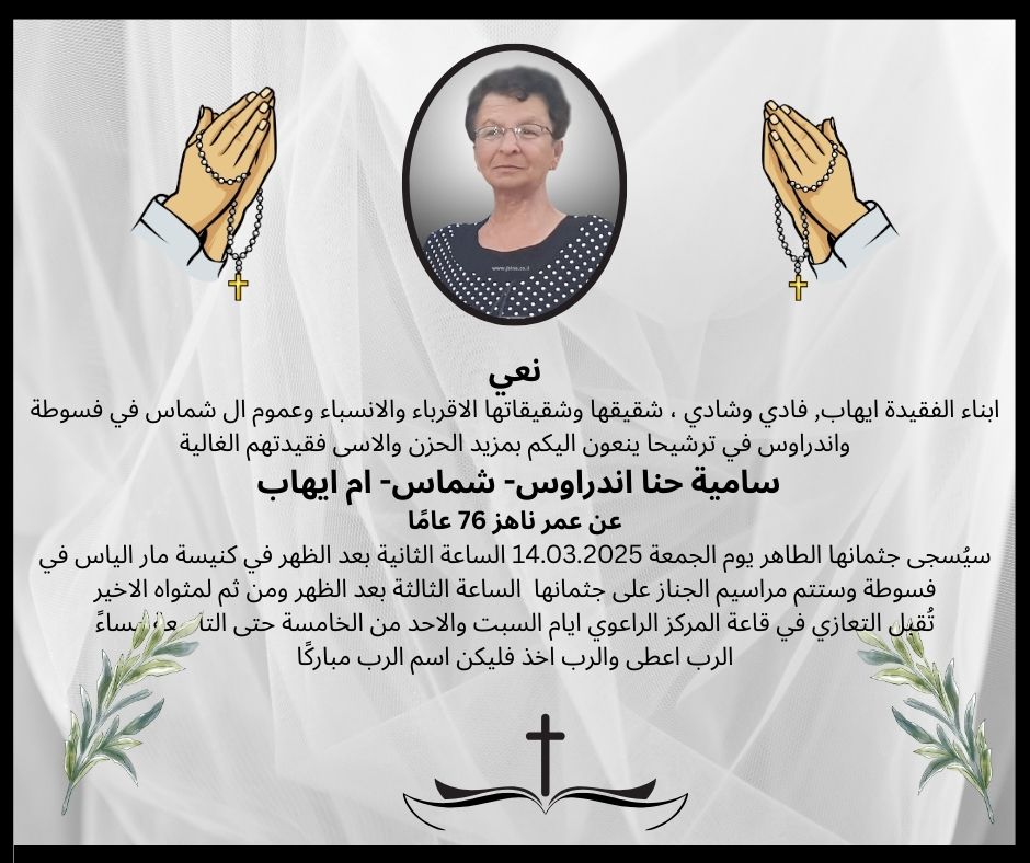 13 مارس فسوطة- وفاة طيبة الذكر سامية حنا نحاس-اندراوس- ام ايهاب من طرف : مصادر اخرى 2025-03-13 وفيات فسوطة- وفاة طيبة الذكر سامية حنا نحاس-اندراوس- ام ايهاب