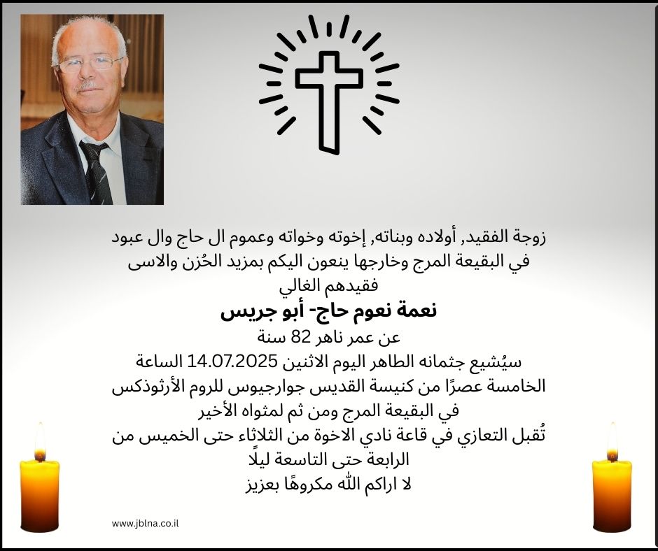 14 يوليو البقيعة المرج- وفاة طيب الذكر نعمة نعوم حاج- ابو جريس من طرف : مصادر اخرى 2025-07-14 وفيات البقيعة المرج- وفاة طيب الذكر نعمة نعوم حاج- ابو جريس
