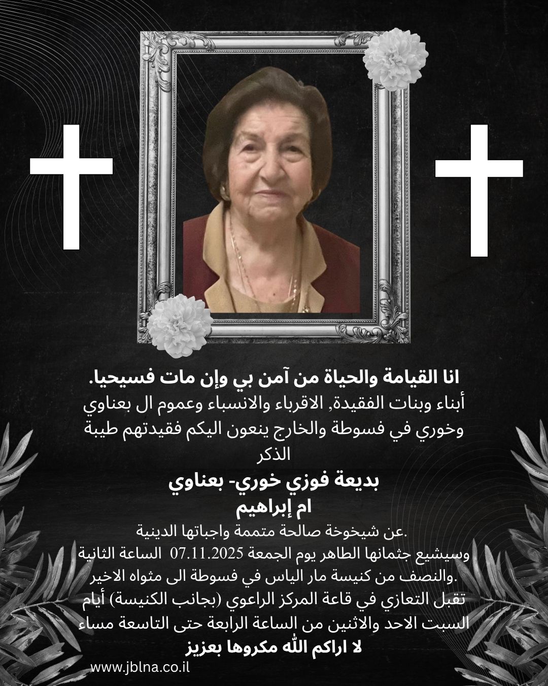 06 نوفمبر فسوطة- وفاة طيبة بديعة فوزي خوري بعناوي- ام ابراهيم من طرف : مصادر اخرى 2025-11-06 وفيات فسوطة- وفاة طيبة بديعة فوزي خوري بعناوي- ام ابراهيم