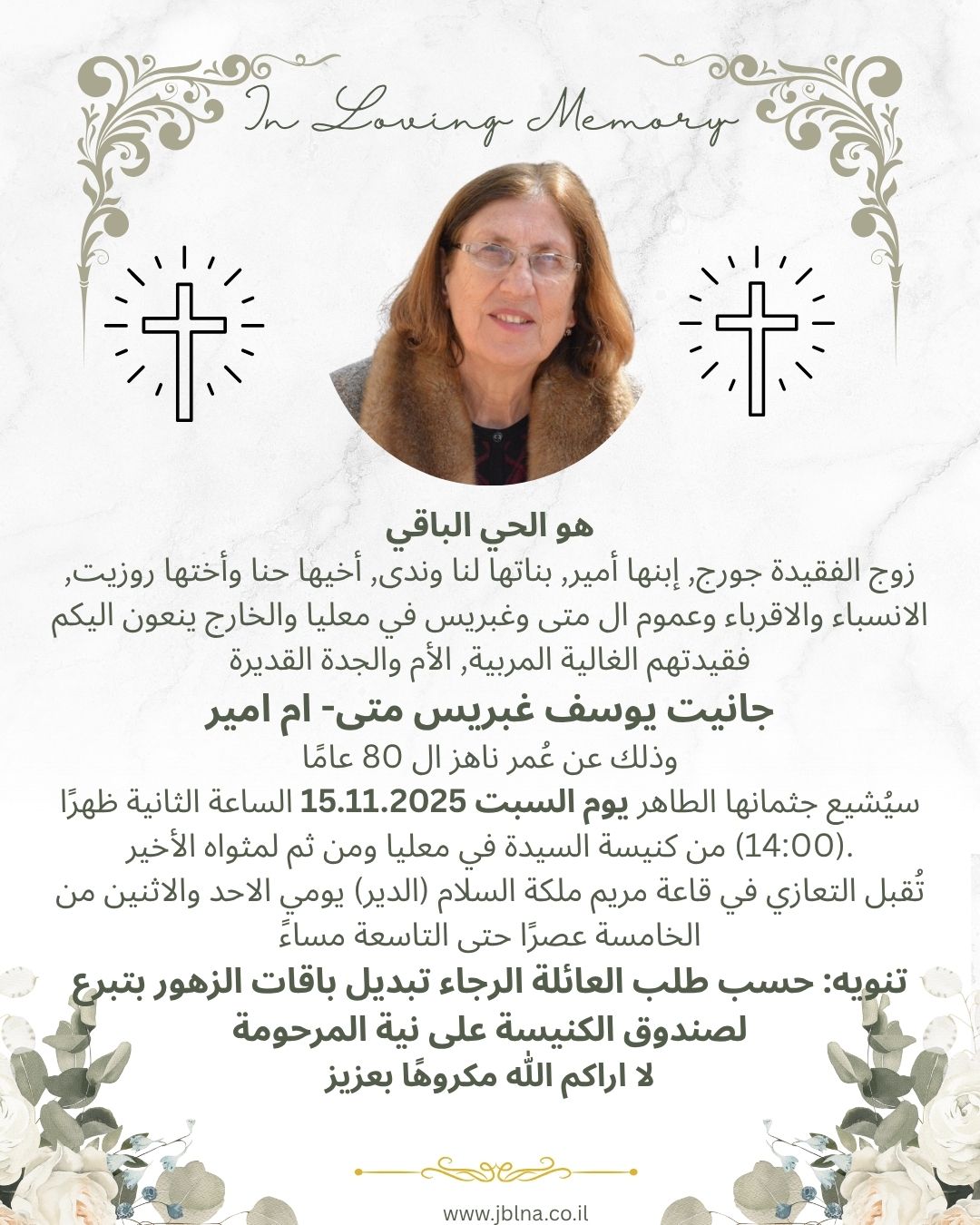 13 نوفمبر معليا- وفاة المربية القديرة جانيت غبريس متى-ام امير عن عمر ناهز 80 سنة من طرف : مصادر اخرى 2025-11-13 وفيات معليا- وفاة المربية القديرة جانيت غبريس متى-ام امير عن عمر ناهز 80 سنة
