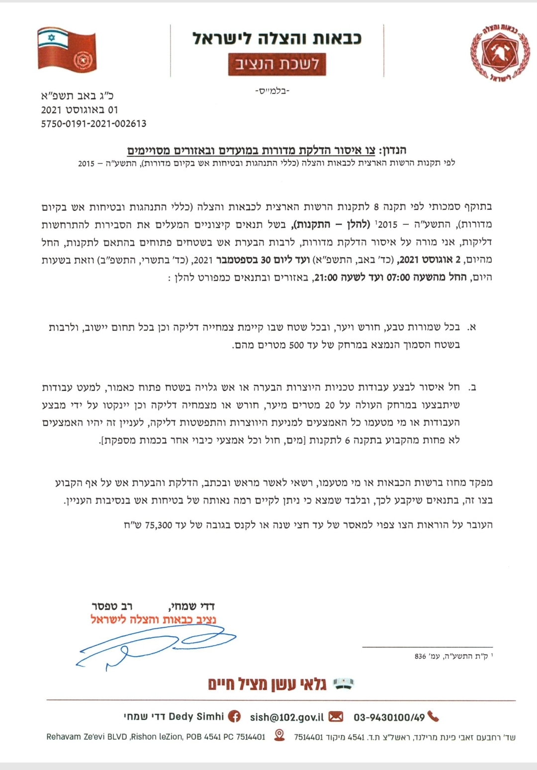 وعلى صعيد متّصل، أصدر قائد الإطفاء والإنقاذ الإسرائيلي، الجنرال ديدي سمحي، أمرًا يقضي بحظر اشعال المشاعل، المواقد والنيران في المناطق المفتوحة وذلك بدءًا من يوم الاثنين الموافق 02.08.2021 وحتى يوم 30.09.2021، وذلك بين الساعات 07:00 صباحًا وحتى 21:00 مساءً.