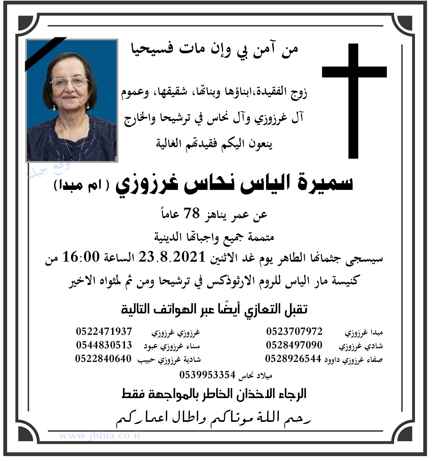 سيُشيع جثمانها الطاهر يوم غد الاثنين 23.8.2021 الساعة الرابعة عصراً من كنيسة الروم الارثوذكس في ترشيحا ومن ثم لمثواه الاخير