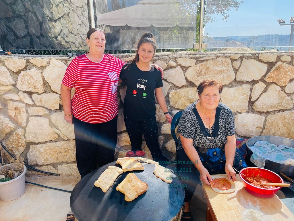 بعد ذلك اجتمع الجميع في منزل والد التلميذة ملك عبد، حيث انتظرنهن الجدات بوفرة من الترحاب ومذاقات المأكولات التي تتعلق بالزيت، مناقيش، ملاتيت، كعك اصفر وغيرها..