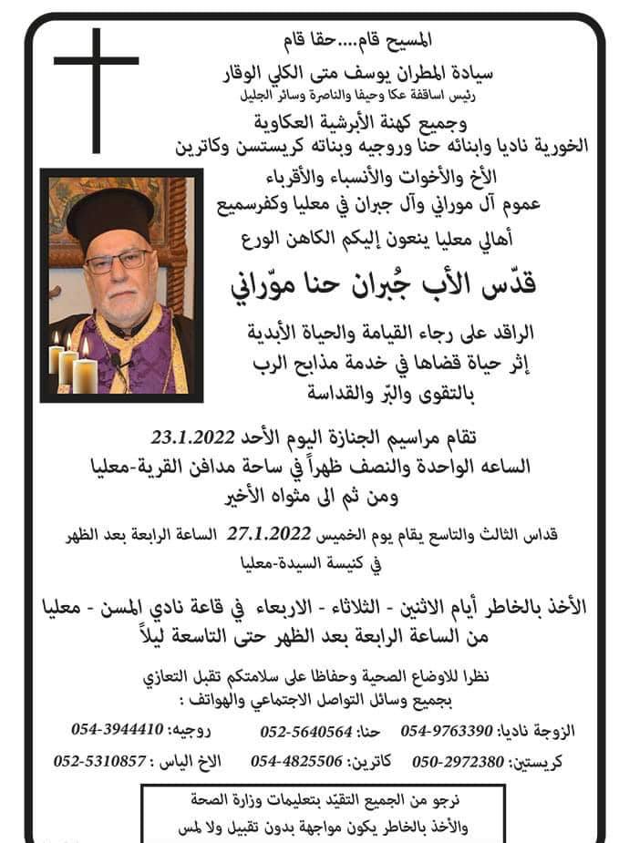 معليا- الاب جبران حنا موراني ينتقل للأخدار السماوية عن عمر يناهز 68 سنة