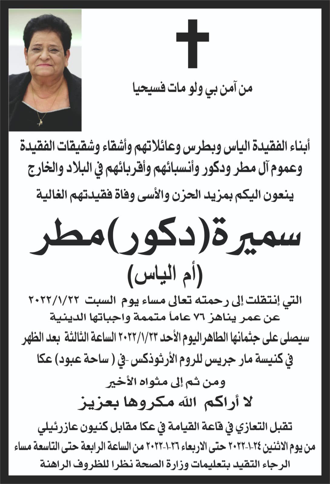 23 يناير عكا ترشيحا- وفاة الفاضلة سميرة جريس دكور مطر- ام الياس عن عمر يناهز 75 سنة من طرف : مصادر اخرى 2022-01-23 وفيات #عكا #ترشيحا اعلان #وفاة فاضلة #سميرة جريس دكور مطر ام الياس الله يرحمها المرحومة ابنة المرحوم جريس رفلي دكور وشقيقة منير، انور وسمير دكور من ترشيحا