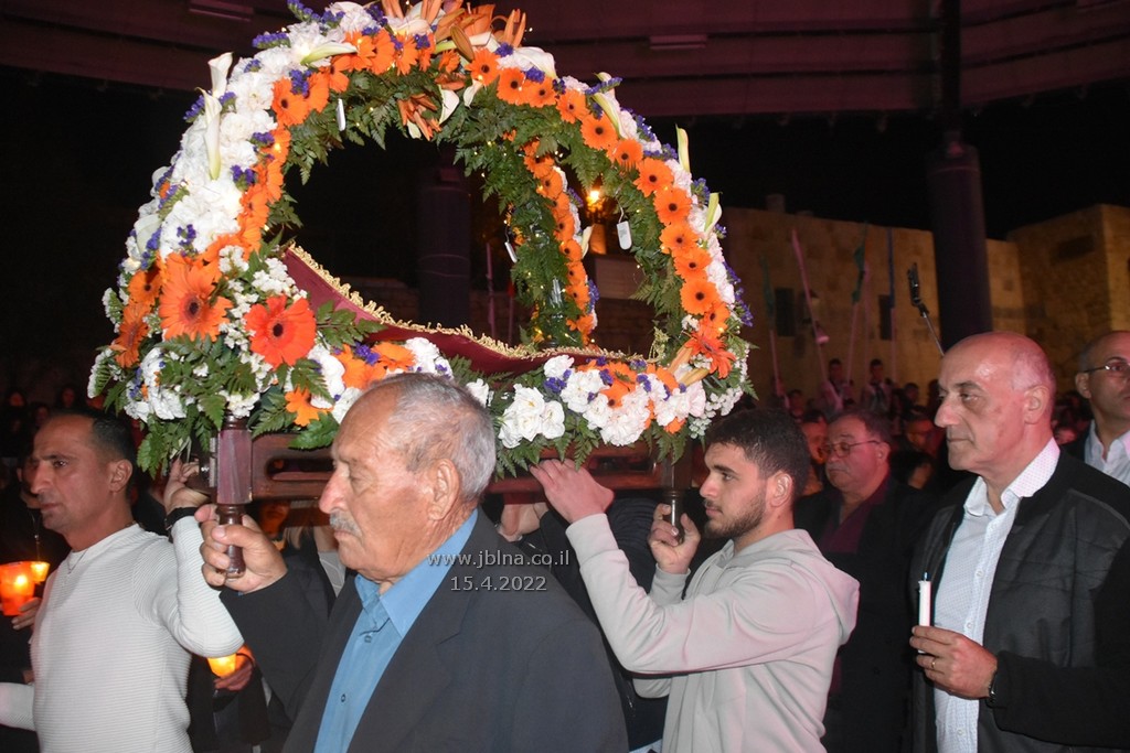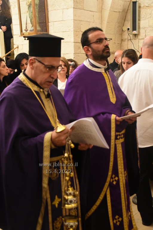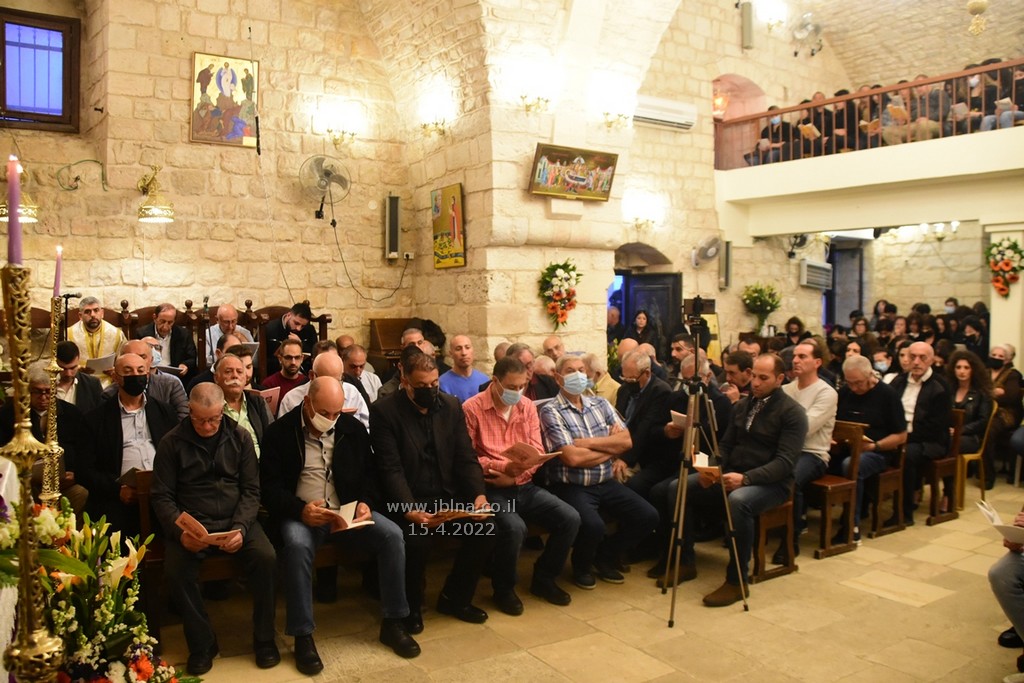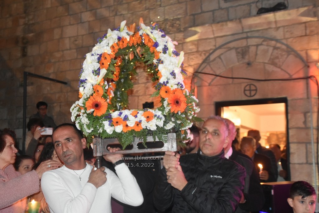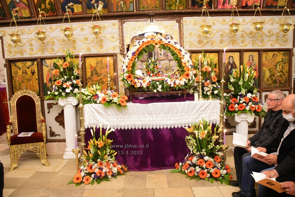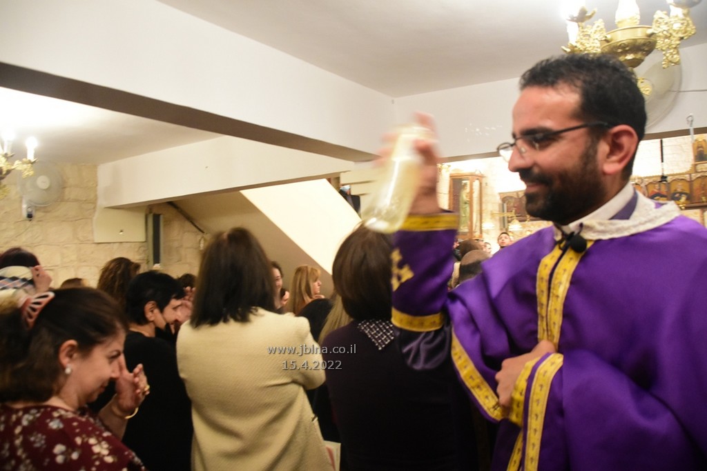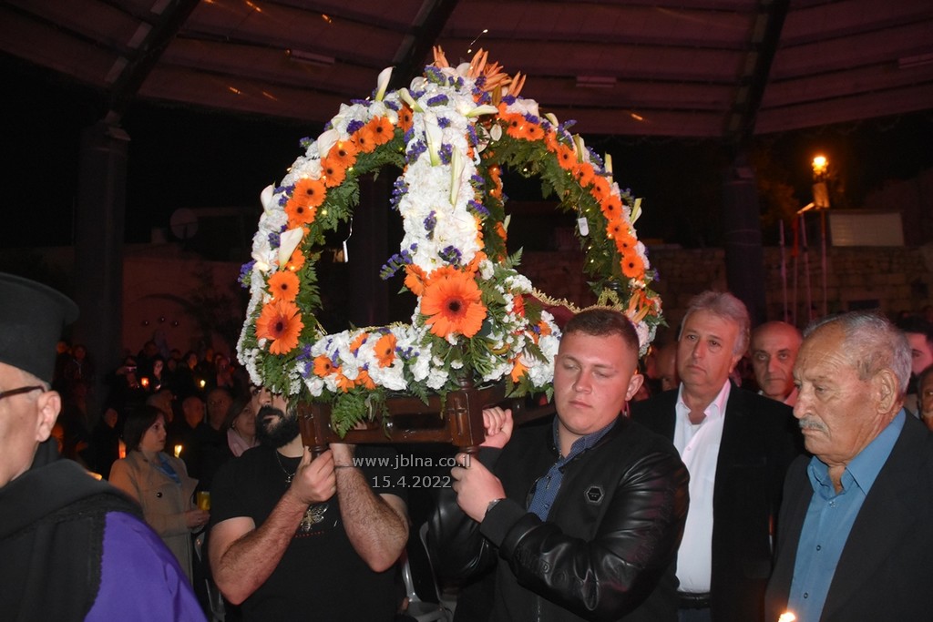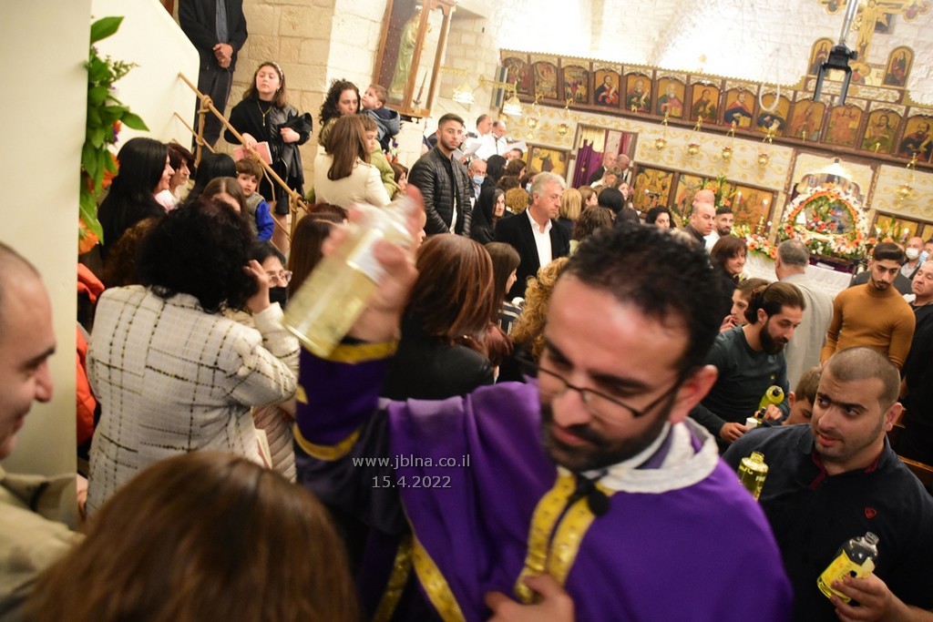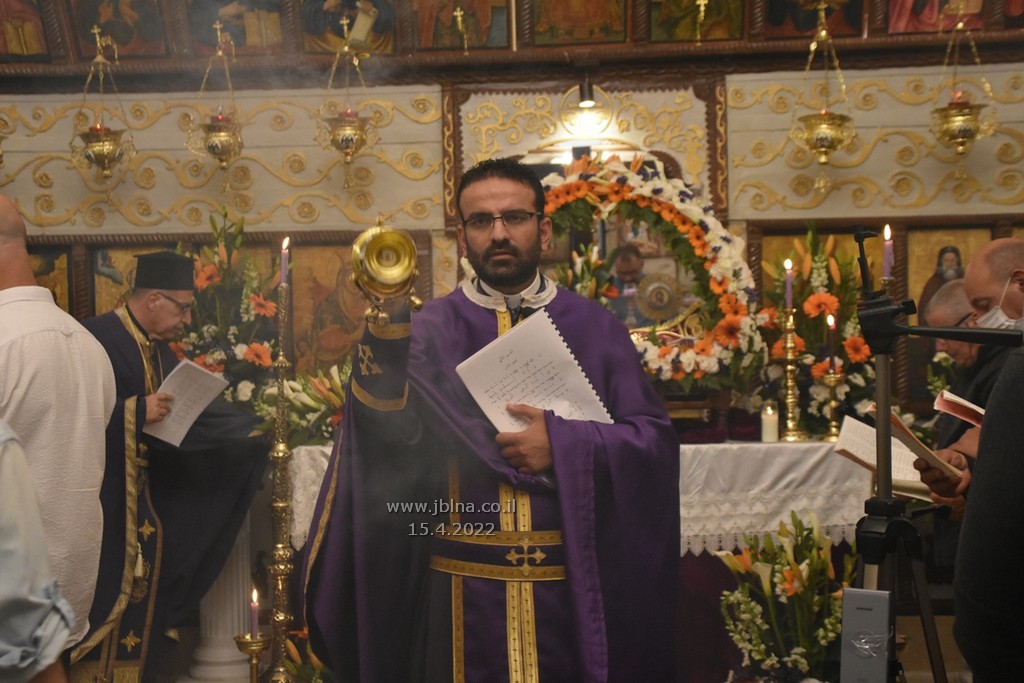 ادار القداس الالهي كاهن الرعية الاب نديم شقور والاب..... مع جوقة الكنيسة والمصلين., وبعد الصلوات المرافقة لهذه الليلة المهيبة, طاف الكهنة أولاً برش العطور على المصلين بمرافقة ترتيلة (حاملات الطيب), وفي ختام الجناز, أطفئت الانوار, واضيئت الشموع في ارجاء الكنيسة وباحتها, وطاف المسنين والمصلين بالسرير الذي يُمثل نعش يسوع بأجواء جميلة جداً بمرافقة طبول كشافة معليا...