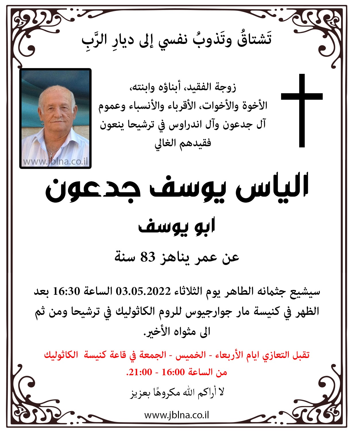 02 مايو ترشيحا- وفاة الفاضل الياس يوسف جدعون- ابو يوسف- عن عمر يناهز 84 سنة من طرف : مصادر اخرى 2022-05-02 رياضة ترشيحا- وفاة الفاضل الياس يوسف جدعون- ابو يوسف- عن عمر يناهز 84 سنة