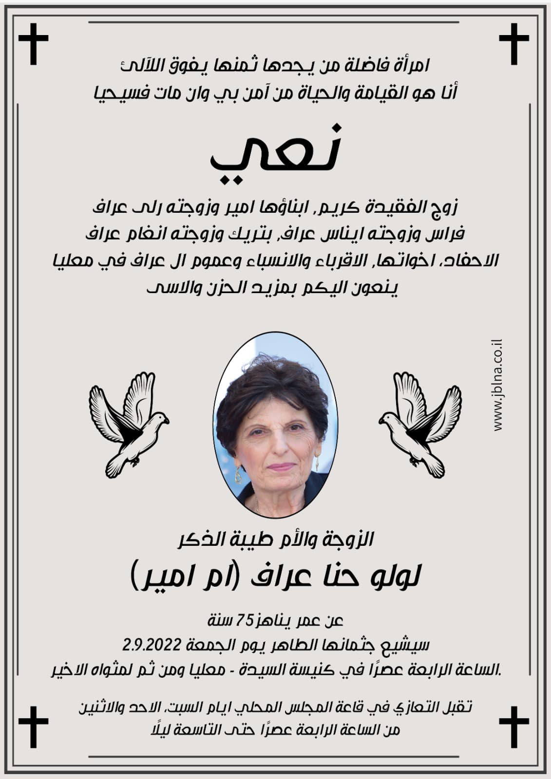 01 سبتمبر معليا- وفاة الفاضلة لولو حنا عراف- ام امير, عن عمر يناهز 75 سنة من طرف : مصادر اخرى 2022-09-01 وفيات معليا- وفاة الفاضلة لولو حنا عراف- ام امير, عن عمر يناهز 75 سنة